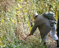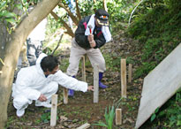 2日目、前日の参加者の「ミツバチの巣のありそうな場所がある」という話を手がかりに、ワークショップ参加者と藤原さんの10名ほどで、午前中から牧島や外平地区でミツバチを探索。 午後、巣箱を御所浦島洲の田地区の畑に、参加者と藤原さんが協力して据付けます。その巣箱に福岡から宅急便で送られてきた日本ミツバチを移し変えます。 |