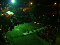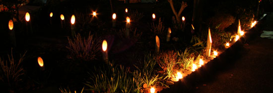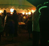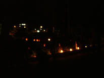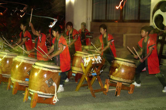 2007年元旦の嵐口春日太鼓新春ライブと竹筒ローソクの話。 時計の針が子の刻(午前0時)を告げると同時に「ソーリャ」の掛け声がかかり、嵐口春日太鼓保存会の演奏がはじまった。 新年早々のイベントとして地区の皆さんにも好評を博している演奏は西暦2000年から続いている。 しかし・・・。 ローソクが悪かったのか、竹筒が悪かったのか定かではないが凪ぎ(なぎ = 波風が無い)にもかかわらず消灯するローソクが続出した。かろうじて光を放っていても竹筒の内側はローソクの炎から発せられる大量のススで辺りに劣らない漆黒と化した。ローソクの光が竹の内面に反射し、ほのかな光を放つという目論見は外れた。 「えらい暗かにゃ~(とっても暗いなあ)」 主催者はローソク単独での採光を断念したのだ。 幻想的な光は、未確認飛行物体の着陸を思わせるきらびやかな水銀灯の光に変わった。太鼓の小気味よいリズムは心を鼓舞する軍艦マーチを連想させ、会場は、あたかも遊技場の店内のような雰囲気に。 |