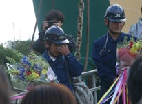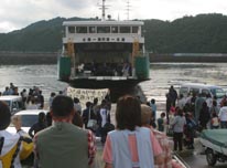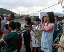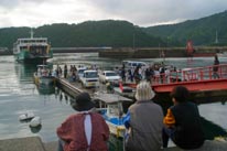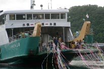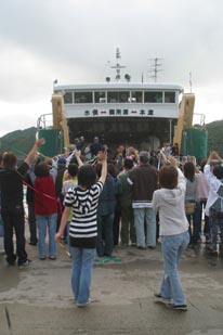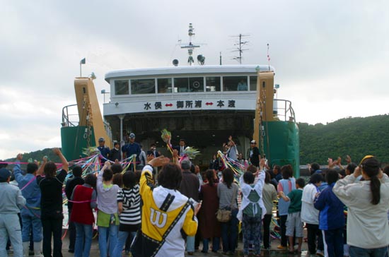仕事や通学に欠かせない島民の足であった水俣航路。 年配の島民であれば、桟橋が出来る前は眉島まで渡し舟で渡り、そこから乗船していたと懐かしげに語る。 船も当時の長水丸の思い出が深いかもしれない。 かまがりから水俣航路本郷港最後の乗客が降り、お別れの式典が行われた。知己の島民から船員に花束が手渡される。 水俣航路最後の出航時が来た。何十本という色とりどりの紙テープが島民とかまがりを繋いでいた。 |
