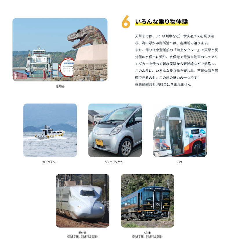 定番の化石発掘体験や恐竜から、魚さばきから島の料理などの島の生活体験に加え、天草まで、バス、新幹線、A列車、定期船、海上タクシー、シェアリングカーなどいろんな乗り物体験で不知火海を周遊できるプランになっています。