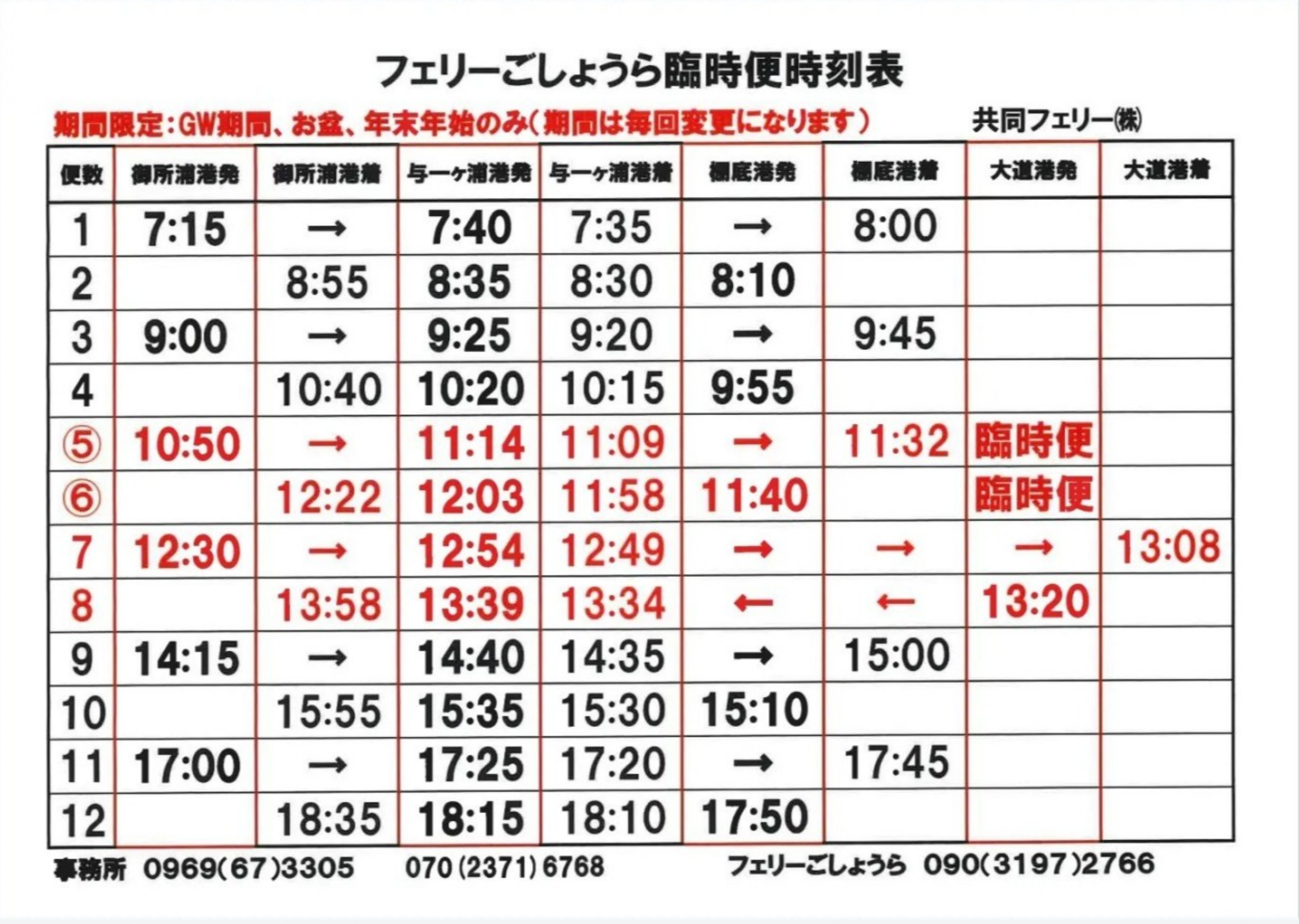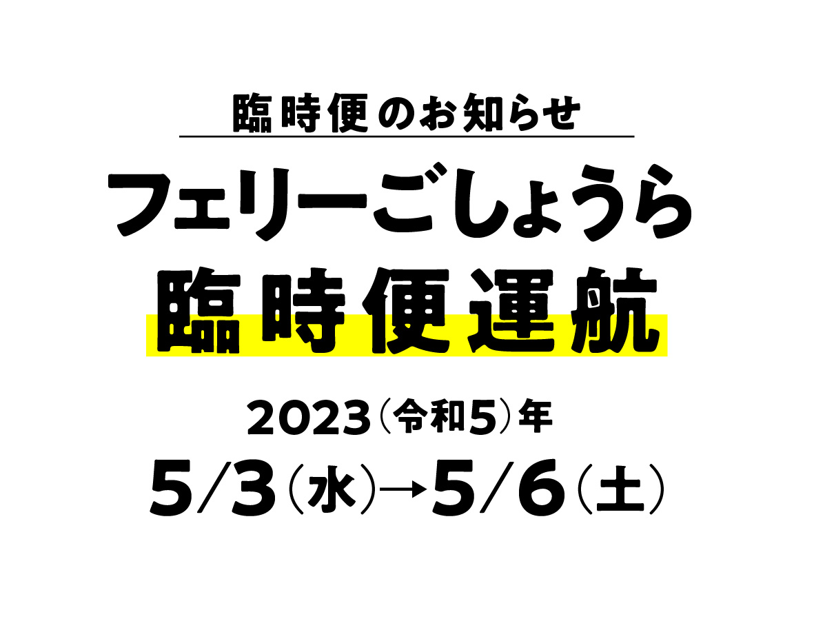 5月3日(水)から6日(土)に、フェリーごしょうらの臨時便運航いたします。 時刻は下表をご確認ください。