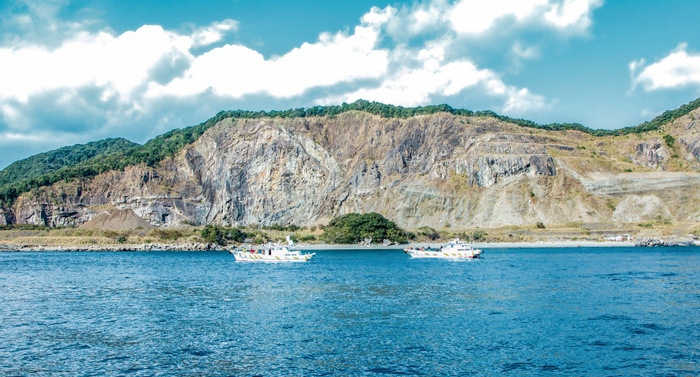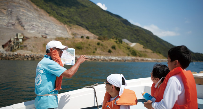 御所浦港を出発し、ガイドとともに船上から化石発見地を観察。採石場跡地に上陸して、アンモナイトや貝類など白亜紀(約1億年前)の化石採集を楽しむことができます。ガイドの解説で地質や化石の成り立ちを学びながら、陸からはアクセスできないスポットも含めて島の自然を満喫するプログラムです。