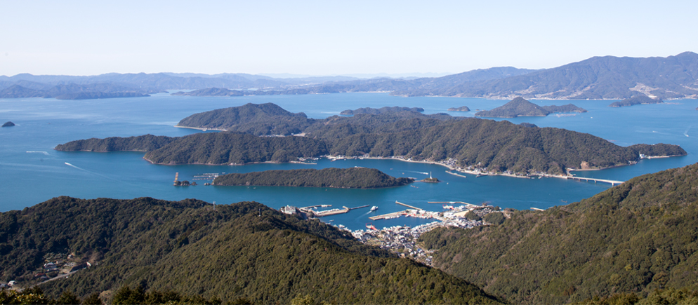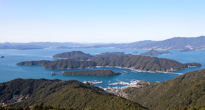 御所浦港から車で出発。曲がりくねった林道を進むと20分ほどで御所浦町の最高峰、標高442mの烏峠の頂きに到着します。烏峠展望台から望む360度のパノラマビューは、まさに“絶景”という言葉がぴったり。波の穏やかな不知火海に浮かぶ御所浦町の姿を一目につかむことができます。
