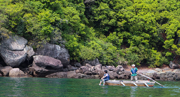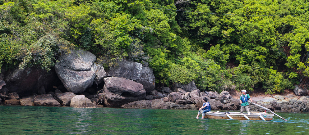 その伝馬舟に乗り、櫓を漕ぎながら、静かな入り江をゆったりと遊覧します。